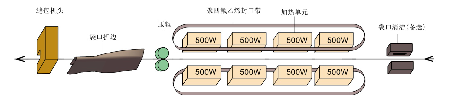 热封缝合工作流程:袋口清洁(备选)→内袋热封(4组加热块加热:聚四氟乙烯封口带使加热块与袋子不直接接触,以保护袋子外表不与加热块粘连)→压辊压合→袋口折边→缝包机:外袋缝纫